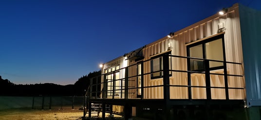 ようやく形になった、念願のコンテナ設置の様子。窓からむこうの景色が見える。