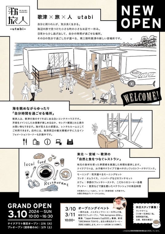 宮城県沿岸の町、南三陸町の北部地域「歌津」の沿岸被災後の空き地に、賑わいの風を吹かせたいと構想をはじめ、補助金やクラウドファンディングなどを得て念願のコンテナショップが2024年3月10日(日)に、311になぞらえてグランドオープン予定。