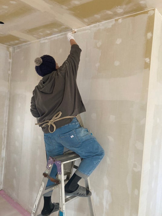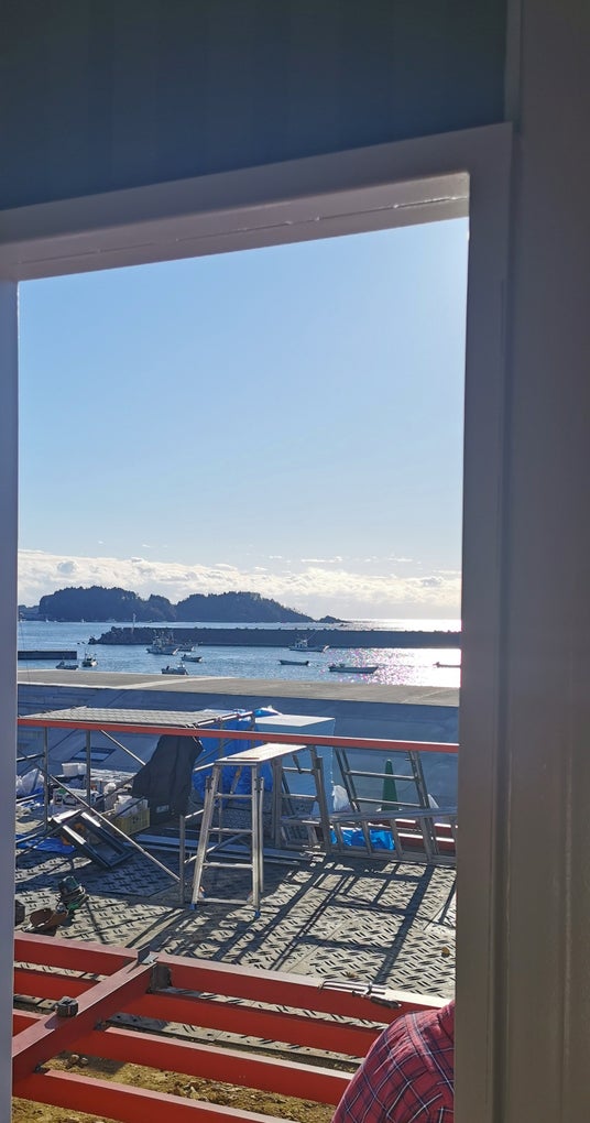 業者さんや友人、娘に手伝ってもらいながら、室内塗装。下塗りと二回塗りで3回塗りました。現場にいることで業者さんとのやりとりがスムーズで、そしてなにより職人さんの仕事に尊敬しました。・・・作業中も外を見れば海。釣り人もよく訪れます。