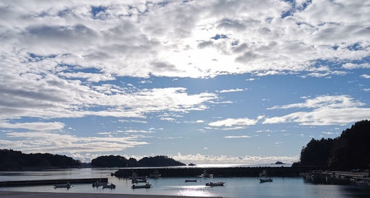 店舗前に広がる伊里前湾。漁師町の朝は早い。晴れの日は朝の光がまぶしく美しい。時間によって変わる景色も心を和ませる。ぜひ美しい港町を見に来てください。