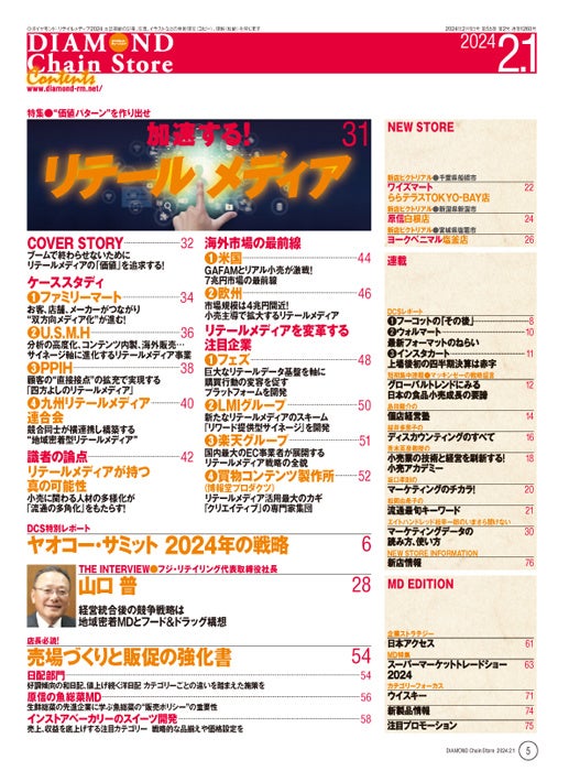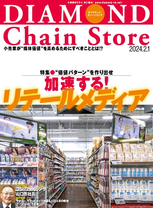 リテールメディアを一時のブームで終わらせることなく、流通ビジネス全体を変革するためのツールへといかに育て上げるか。小売企業の取り組みを中心に、リテールメディアの現在地とこれからを展望しました。このほか、今号のThe Interviewにはフジ・リテイリング(愛媛県)の山口普社長が登場。マックスバリュ西日本との経営統合による新生・フジの誕生を間近に控えるなか、今後の経営環境をどう見据えるのか。地域密着MDの方向性や新たなフード&ドラッグ構想など新たな取り組みについても明かしてくれました。また、特別レポートとして「ヤオコー・サミット2024年の戦略」をお届け。首都圏の有力スーパー2社のトップは今年をどう展望するのか。こちらも見逃せない内容です。今号も盛りだくさんの内容でお送りしますので、ぜひご購読のほどよろしくお願いします!
