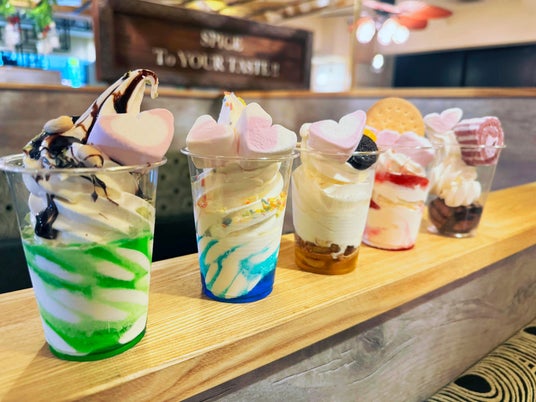 デザートコーナーにはソフトクリームやソースなどトッピングも充実!