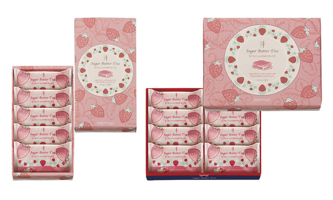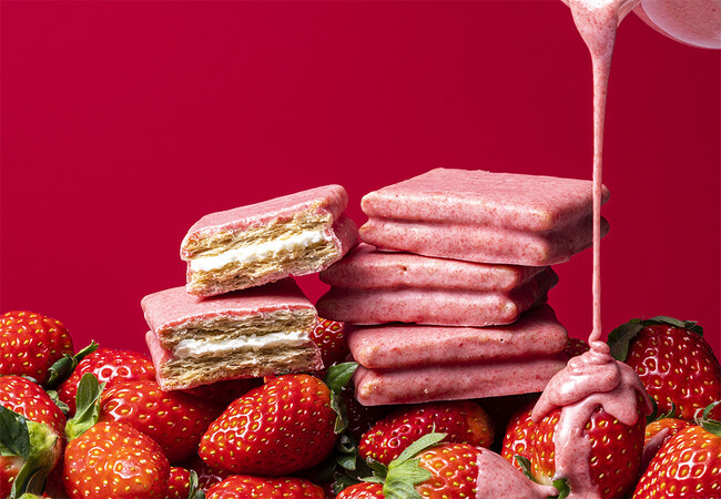 さらにキュートなパッケージデザインにも注目!テーマは“ストロベリー・ティータイム”。パステル調の苺がならぶ楽しいムードのクロスを広げて、とっておきの真っ赤な苺模様のお皿をセット。お皿のまんなかに『いちごショコラがけサンド』を添えました。可愛い遊び心のあるパッケージは、自分用のおやつはもちろん、ホワイトデーのお返しやちょっとしたギフトにもぴったりです。