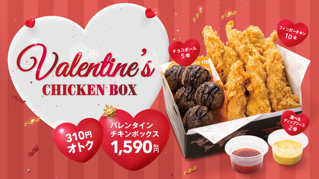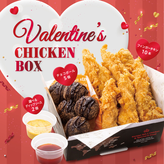 ワタミ株式会社(本社:東京都大田区、以下ワタミ)が韓国ジェネシスBBQ社と提携し国内で運営する、韓国No.1 フライドチキンチェーンブランド『bb.q オリーブチキンカフェ(以下、オリーブチキンカフェ)』は2月8日(木)~2月14日(水)の期間限定で、『バレンタインチキンボックス』(1,590円税込)の販売をいたします。本商品は定番人気のチキンフィンガー10本(選べるディップソース2個付)と新商品のチョコボール5個がセットになっており、単品積み上げ価格に対して310円オトクなセットとしてご用意しました。国産ささみをオリーブオイル使用の特製フライオイルで揚げた軽やかな食べ口で人気の「オリーブチキンフィンガー」と、濃厚チョコソースを表面はカリっと中はもっちりとした皮で包み込んだ「チョコボール」を一度に楽しめる期間限定ボックスです。