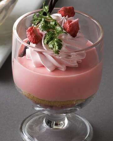 ジューシーなフレッシュいちごに、つるっとのど越しの良いジュレをまとわせて。さっぱりとお口直しにもおススメ。