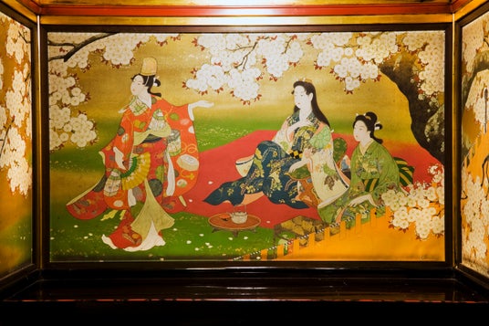 このデザインの原画は、東京都指定有形文化財「百段階段」の一室、漁樵(ぎょしょう)の間の壁画で大正から昭和初期に活躍した名画家・菊池華秋によるものです。東京都指定有形文化財「百段階段」は、ホテル雅叙園東京の前身である料亭・目黒雅叙園の3号館として今からおよそ90年前に建てられ、漁樵の間の室内は、純金箔、純金泥、純金砂子で仕上げられています。極彩色の木彫りや日本画に囲まれた絢爛豪華な設えは、息を呑むほどの美しさ。当時、料亭の宴会場として晴れやかな宴が行われていたこの建物は、現在は企画展開催時のみ一般公開しております。