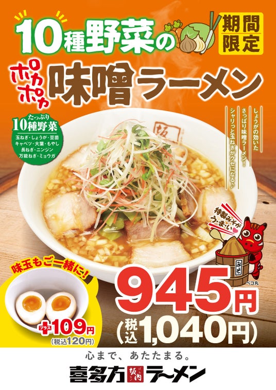 昨年に続き今年も登場!彩り豊かな10種の新鮮野菜をたっぷり乗せた『10種野菜のポカポカ味噌ラーメン』は、おろしたて生しょうがのフレッシュな辛みが味噌スープに浸透し、食べ進めるにつれて身体の芯からじんわりポカポカ温まる冬におすすめのラーメンです。たっぷりの10種野菜は、おろししょうが、スライスしたキャベツや長ネギ、みょうが、豆苗、大葉、万能ねぎ、にんじん、もやしに加え、シャリシャリとした歯ごたえがアクセントの粗みじんにした玉ねぎを使用しており、自慢のトロうま焼豚はもちろん5枚トッピング。さっぱりしつつもパンチの効いた当商品は、食物繊維もたっぷり摂っていただけるのでヘルシーさが嬉しい一杯です。