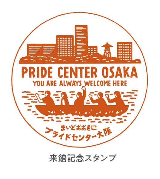 朝野ペコさんの描き下ろしのスタンプとカードは、プライドセンター大阪の目の前を流れる大川に船を浮かべ、船上から大阪の街へ手を振るデザイン。大阪の街並みの合間には八軒屋浜にある灯籠も見え、空にはLGBTQの象徴である6色の虹がかかっています。スタンプインクで使用しているオレンジは、虹色6色の中で「ヒーリング/癒し」を意味する色で、プライドセンター大阪のミッション「Remedy for all」を表現しています。