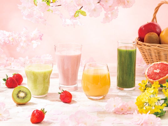 今回は春が旬のいちご、グレープフルーツ、キウイなどのフルーツの他、菜の花を使った季節を味わうことができるスムージーを計4種取り揃えました。