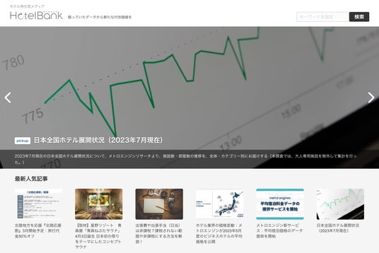 宿泊や観光関連のニュース情報をお届けするホテル特化型メディアです。また、メトロエンジンが独自に保有する宿泊関連データを活用した市場調査・分析記事もお届けしています。