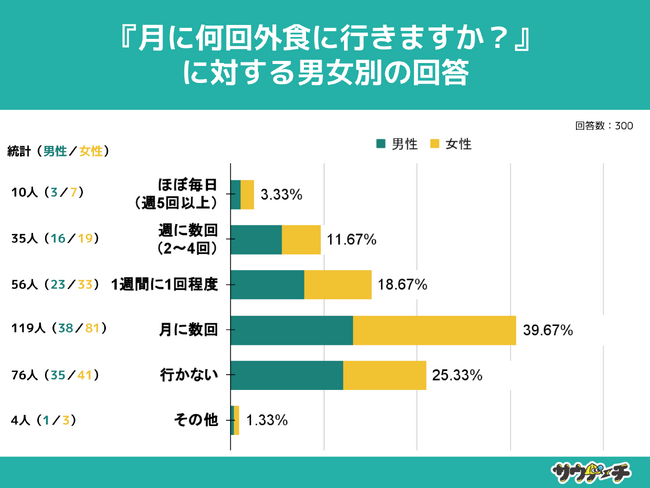 10~30代男女を対象とした『月に何回外食に行きますか?』というアンケートで、最も多かった回答は「月に数回」で約40%でした。