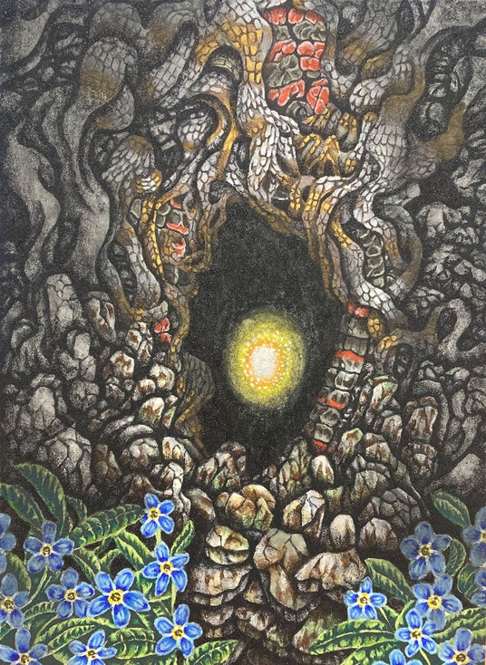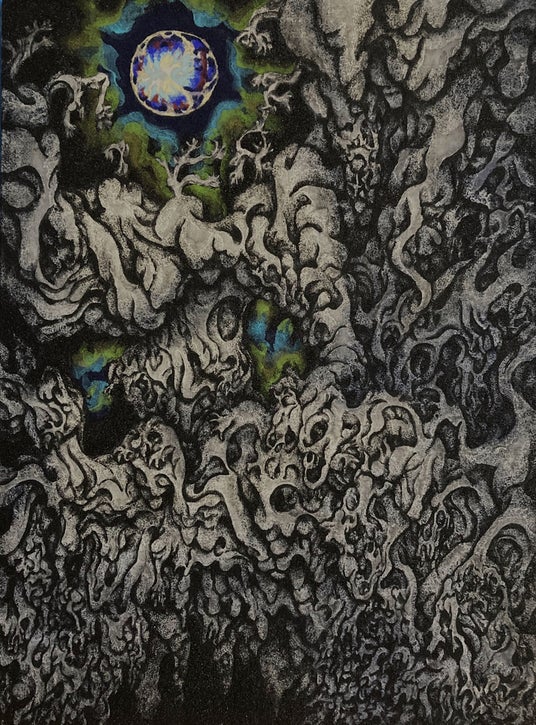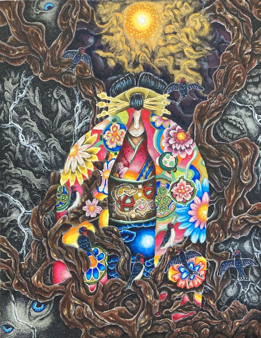 「天地創造」(C)?岡部仁美 2023 F10 木製パネル/天竺綿布、岩絵具、顔料