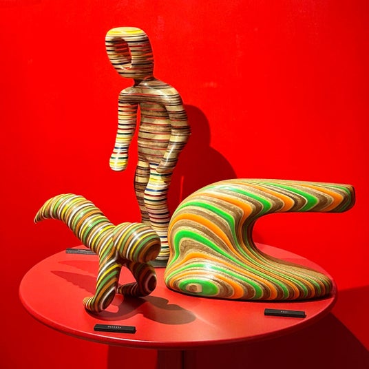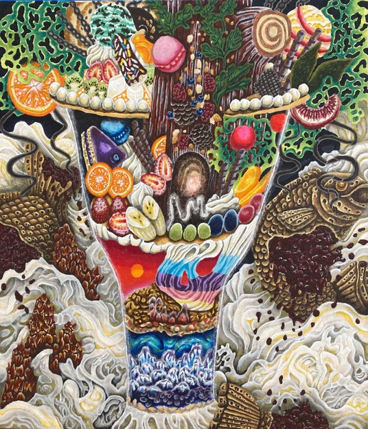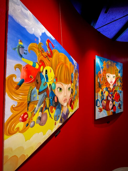 左)「ぶつかり合う声」右)「ミニチュアールの戯れ」キャンバス/アクリル、油彩、磁器 (C)?吉川薫 2023