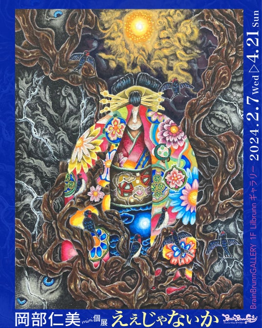 岡部仁美個展メインビジュアルひたすら自由で『ええじゃないか』という想いで。 岡部仁美が本展示に選んだ本テーマ「ええじゃないか」は、彼女の視点から浮かぶ自然の中にある普遍性を人間社会を通して作品に表現しています。