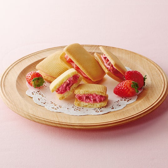 口どけのよいストロベリークリームと、はみ出るほどごろっとしたいちごの実をバターのサブレで挟みました。