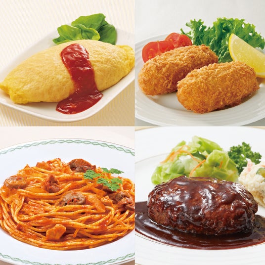 「オムライス」「ナポリタン」「ハンバーグ」は電子レンジで温めるだけ、「カニクリームコロッケ」はそのまま揚げるだけでお召し上がりいただけます。