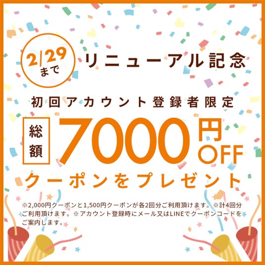 リニューアルを記念して2月9日~2月29日の期間中にアカウント登録頂いた方に総額7,000円のクーポンをプレゼントいたします。