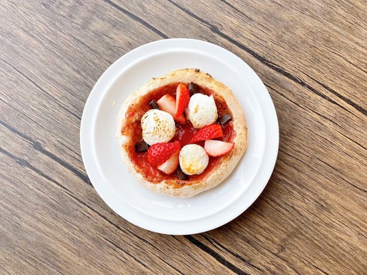 ピザ生地に、いちご、チョコレートソースなどをお好みでトッピングできます。デコレーションしていただいたピザは、八天堂ビレッジ内のピザ窯で焼き上げます。