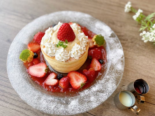 キラキラ輝くいちごにあまおうジャム、いちごクリームと、いちごの宝石箱のような一品です。練乳とメープルシロップで味変しながらお楽しみください。