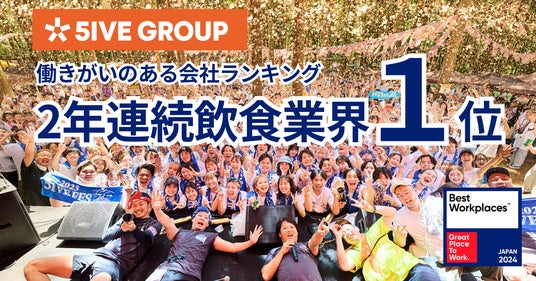 「"楽しい"でつながる世界をつくる」を経営理念とする飲食企業の株式会社ファイブグループ(本社:東京都武蔵野市 代表取締役社長:坂本憲史 以下ファイブグループ)は、2024年2月8日、Great Place to Work(R) Institute Japan(以下GPTW)が主催する2024年版「働きがいのある会社(従業員100-999人部門)」ランキングにて7位にランクインしました。