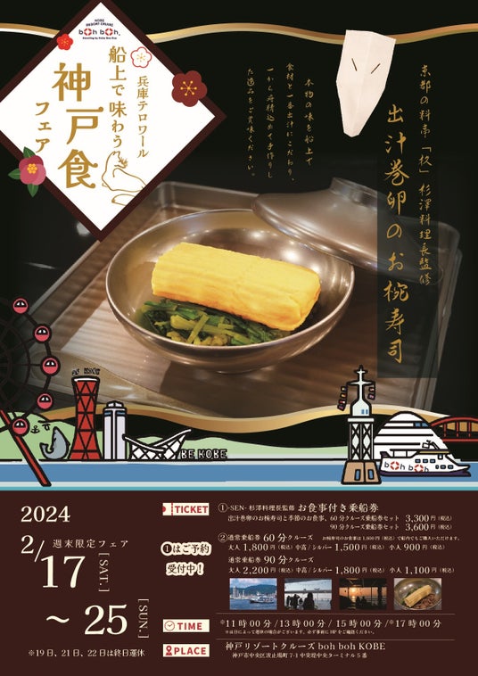 神戸港を周遊するクルーズ船、神戸シーバスboh boh KOBE号では、ここでしか味わうことのできない逸品を船内で調理し、提供しています!2月の週末限定で「神戸食」をお楽しみいただけるフェア「兵庫テロワール boh boh KOBE号 船上で味わう神戸食」を期間限定で開催!