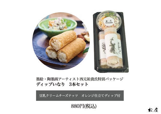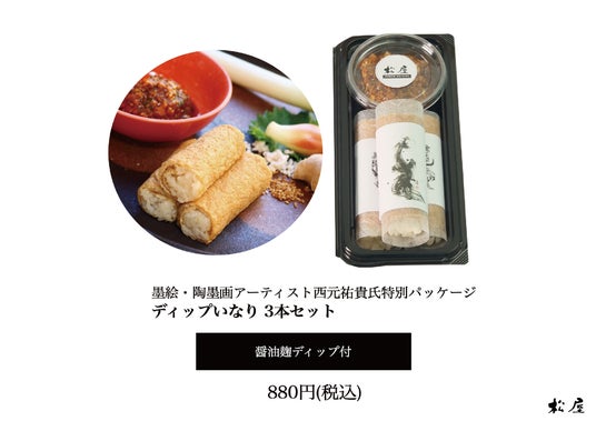 和食処 松屋(住所:愛知県豊川市門前町5)は、2024年2月12日(月)~3月19日(火)の期間限定で新発売「ディップいなり」特別パッケージverを事前予約された方に限り、店頭にて販売いたします。同年1月、日本三大稲荷・豊川稲荷寺宝館にて、特別公開されたことで話題となった墨絵・陶墨画アーティスト西元祐貴氏作品の特別パッケージver(昇竜、阿吽の狐)をご用意いたします。