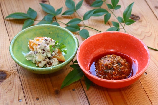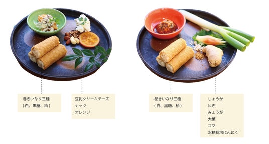 (左)ディップA:豆乳クリームチーズナッツオレンジ仕立て、(右)ディップB:醤油麹香味野菜