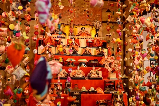 神社の階段118段に飾られるひな人形とつるし飾り。ひな人形を飾る段数は日本一で壮観です。
