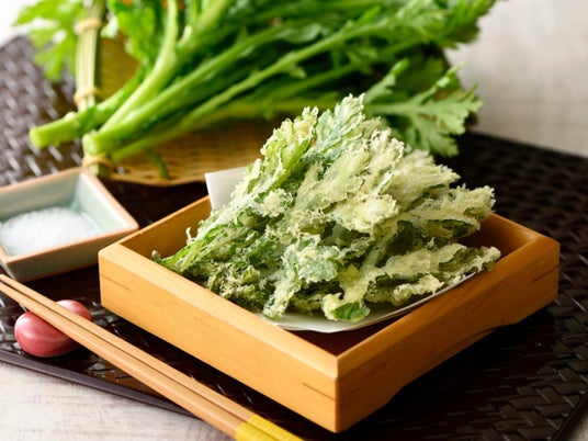 苦みやえぐみが少ない茨城県産「春菊」の本来の美味しさをシンプルに感じられる『春菊の天ぷら』。