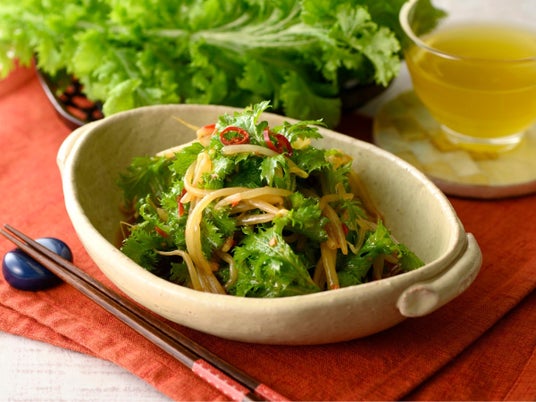 わさびのような爽やかな辛みと香りが特徴の茨城県産「わさび菜」をもやしとともに、ごま油と醤油ベースでほっこり落ち着ける味わいに仕上げた『わさび菜ともやしのピリッとナムル』。