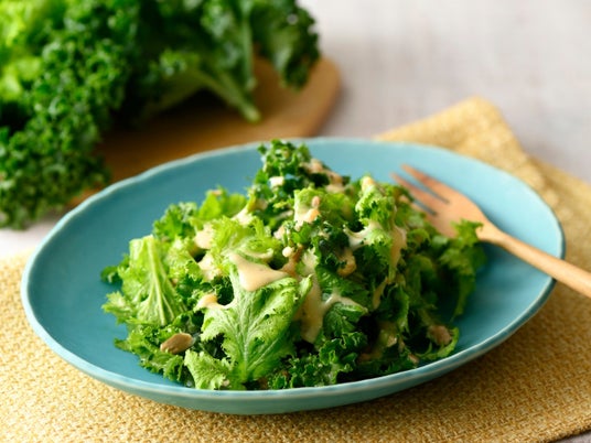 茨城県産の栄養豊富な「ケール」と爽やかな辛みと香りが特徴の「わさび菜」を、もろみそを加えた優しい味わいのクリーミーなシーザードレッシングでいただく『わさび菜とケールのもろみそシーザーサラダ』。