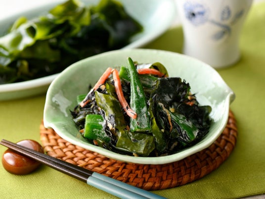 肉厚で弾力が強く磯の香りを感じる豊かな風味の岩手県産「三陸わかめ」をオクラと和風マヨネーズで和えた『三陸わかめとオクラの和風マリネ』。