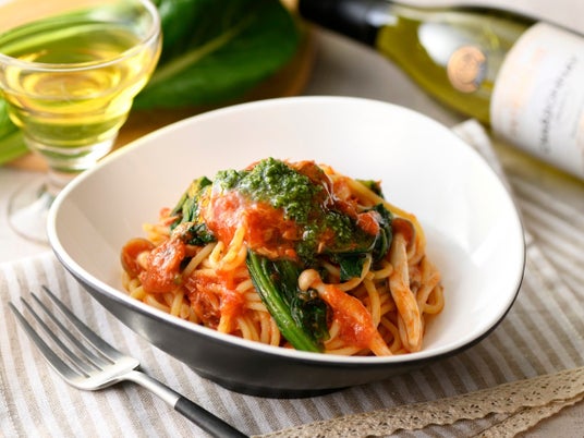 えぐみが少なく、甘みが強い茨城県産の「小松菜」とツナに、ほのかな酸味とレモンが香るトマトソースをまとわせた『小松菜入り冷製トマトツナパスタ』。