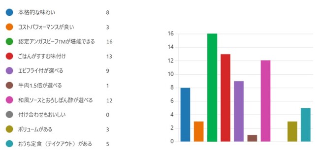 最も多くの票を集めたのは『認定アンガスビーフ(TM)が堪能できる』というポイントでした。2位は『ごはんがすすむ味付け』、3位は『和風ソースとおろしぽん酢が選べる』でした。