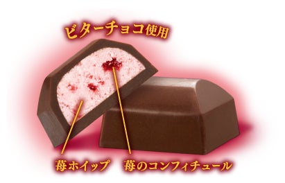 ・国産苺果汁を使用した苺ホイップに、果肉感を感じる苺のコンフィチュールを混ぜ込んだ大粒ビターチョコレート