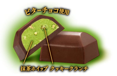 ・愛知県産西尾の抹茶を使用した抹茶ホイップに、国産和栗パウダーとクッキークランチを混ぜ込んだ大粒ビターチョコレート