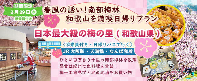 株式会社フォーティーズ(本社:大阪市鶴見区、代表取締役 岡武史)は、大好評につき10席増席しました。2月29日(木) お一人様11,500円!【和歌山県 みなべ】〈大阪駅・天満橋・なんば発着・添乗員付き〉春風の誘い!日本最大級の梅の里、南部梅林と紀州で魚料理を舌鼓!和歌山満喫日帰りプランのオンライン販売を開始しました。ツアー詳細はこちら https://4trip.jp/dome/plan/18486上記商品以外のお得な情報をお届けする公式LINE追加はこちらhttps://lin.ee/JAOTwl0
