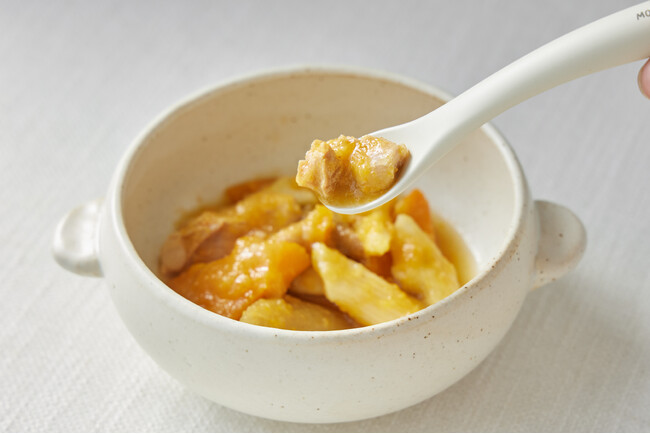 一つ一つ丁寧に手羽元の処理をし、野菜とともに柔らかく煮込みました。手羽元の旨味と野菜の栄養がたっぷりつまった一品です。身がほどけた手羽元の骨は、お子さまがすかさずしゃぶってしまうほど。舌をたくさん動かすことを促した商品です。風邪等の外出できない際のお食事ストックとして用意しておきたいとの声を頂いています。