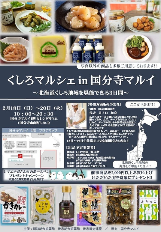 北海道庁 釧路総合振興局では、2024年2月18日(日)から2月20日(火)までの3日間、北海道くしろ地域産品を販売する「くしろマルシェin国分寺マルイ」を開催します!