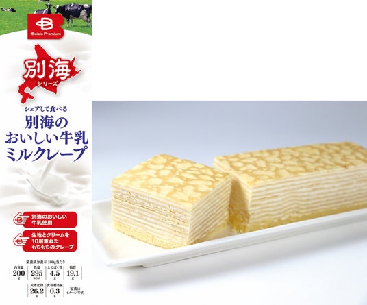 別海のおいしい牛乳ミルクレープ(548円/税込591円)当社で大人気、「別海のおいしい牛乳」シリーズに冷凍スイーツの新作が登場しました。牛乳のもつ濃厚かつスッキリとした味わいを活かしてつくったクリームを、しっとりもちもちの食感にこだわって丁寧に焼き上げたクレープ生地で織り込み、10層に重ねました。食べる分だけカットして解凍できるので、いつでも好きなときに味わえます。