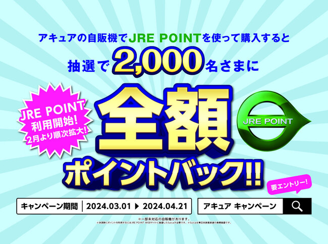 期間中、アキュアの自販機でJRE POINTを利用してドリンク商品を購入すると、抽選で2,000名さまにJRE POINT全額ポイントバックとなります。