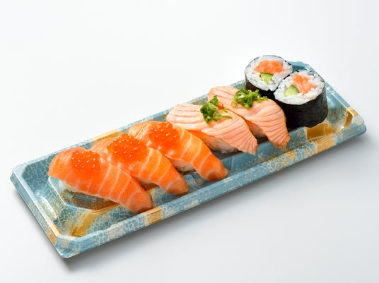 生サーモンの握りにはイクラをトッピング。さらに炙り仕立てに、巻き寿司も。すべてサーモンでそろえたセットです。