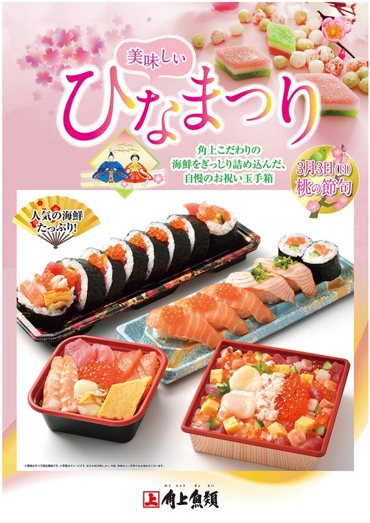 鮮魚チェーンストア「角上魚類」 (角上魚類ホールディングス株式会社 本社:新潟県長岡市)では、たっぷりの海鮮具材がきらめくちらし寿司や、お子様にも人気の高いサーモンづくしの寿司セットなどひな祭りメニュー各種をご用意しております。
