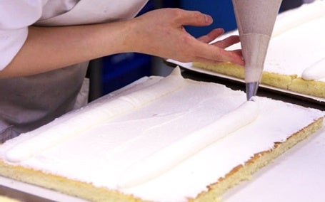 製造工程1前日製造し、店頭に並べることや、生地(スポンジ)の製造工程において、独自製法の混ぜ方を採用し、オーブンの一流ブランド『バッケン』で焼き上げることで、ふわっとしたやわらかなスポンジに仕上げています。また、生地(スポンジ)には砂糖の分量を減らし、はちみつを使用することで、上品な甘みと風味を味わっていただけるもを目指し、
