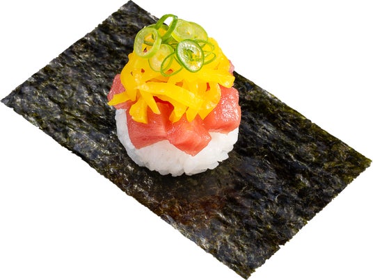 本鮪とろぶつの甘みと、たくあんの独特な味わいや歯ごたえが相性の良い包みです。