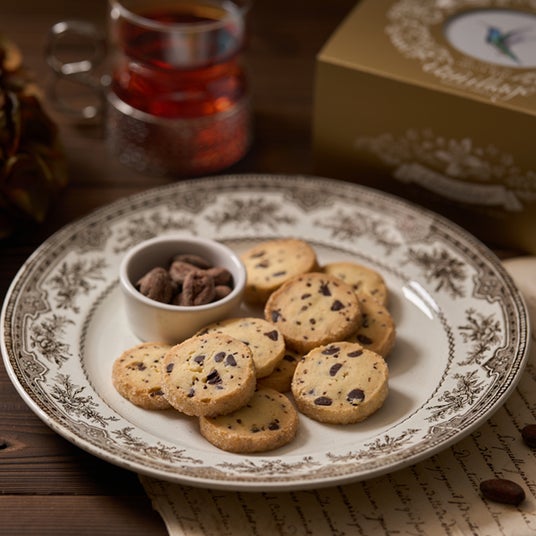 バニラージュ カカオバニーユカカオバニーユは、ブルボンバニラの香りを最大限引き出す配合にこだわったディアマンバニーユに、チョコレートチップ、カカオニブの香りと食感を加えた、よりリッチなクッキーです。カカオニブとは、カカオ豆をローストして細かく砕き、余分な皮などを取り除いたチョコレートになる前の原料で、カカオの香りをダイレクトに感じることができます。