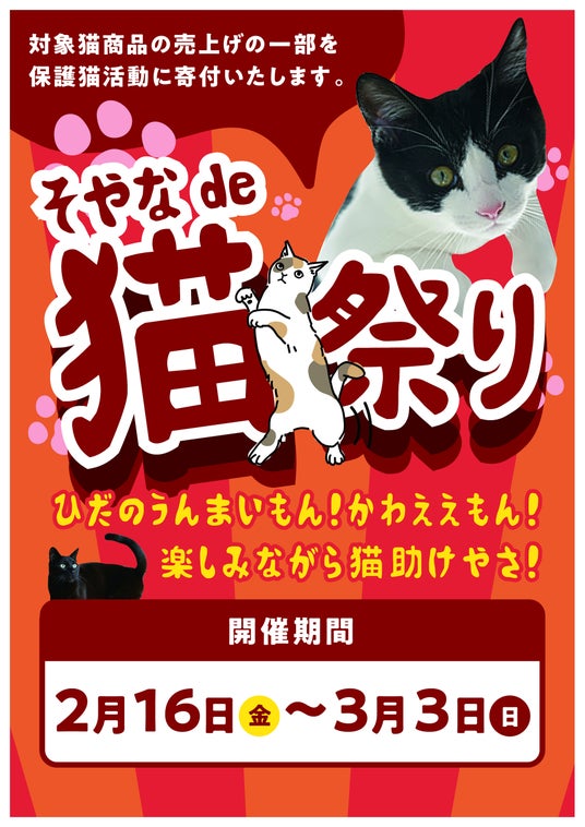 株式会社ヒダカラ(岐阜県飛騨市)は、飛騨市内の8事業者と2月22日(猫の日)に合わせて、保護猫活動を支援するキャンペーンを開催します。猫祭り会期中はお米と惣菜のセット、お菓子、お酒など35商品以上の猫グッズの販売を予定しており、地場産市場そやな(岐阜県飛騨市)及びネット通販ショップのヒダカラ商店にて販売します。