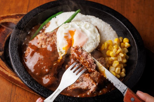 熱々の鉄板で焼き上げたジューシーなハンバーグに、ふわふわの目玉焼きがトッピング!