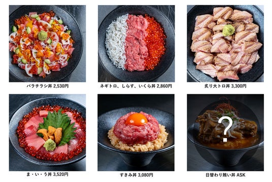 ※「赤身、中トロ、大トロ丼」は「赤身だけ」や「中トロ、大トロの2種」や「赤身と大トロの2種」「赤身・中トロ・大トロの3種」など、その日の気分でセレクトしていただくことが可能です。