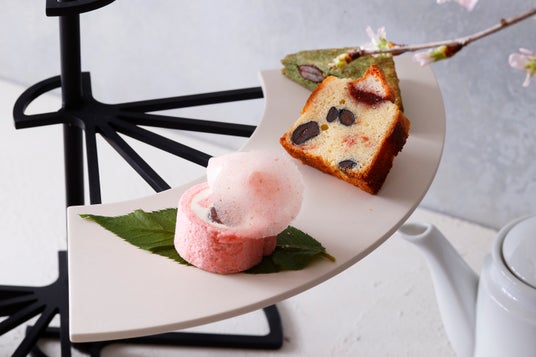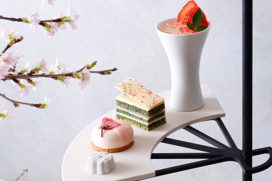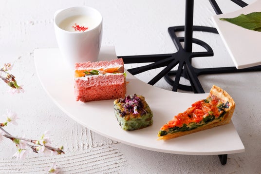 今回のメニューのテーマは「さくら」。複数の層からなる「抹茶と桜のオペラ」は、桜餡を敷き、ビスキュイ生地には、桜の葉で香りづけした抹茶シロップを染み込ませました。他にも、「さくらと大納言のロール」や、「桜と日本酒のパウンドケーキ」など、和素材と桜を組み合わせ、日本の春の情景を表現したスイーツが揃います。セイボリーには、桜海老や菜の花、山菜など、旬の恵みがたっぷり。「よもぎと山菜の焼きリゾット」や、「自家製スモークサーモンと新玉ねぎのサンドイッチ」など、春を存分に味わう4品をご用意いたします。お飲み物は、桜フレーバーの煎茶や紅茶など季節のおすすめティーを含む11種のほか、桜色のスパークリングワインやカクテル付も。